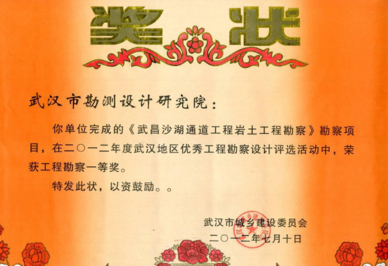 武漢市天然氣高壓外環(huán)線長江穿越工程勘察項目獲2014年度湖北省優(yōu)秀工程勘察一等獎
