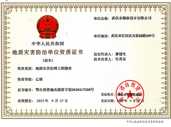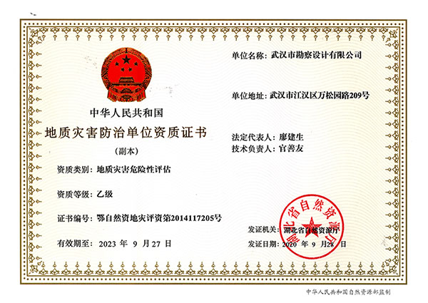 2020年9月28日,公司地質(zhì)災(zāi)害危險(xiǎn)性評(píng)估、勘查、設(shè)計(jì)丙級(jí)升乙級(jí)資質(zhì)申報(bào)材料順利通過(guò)湖北省自然資源廳審核,并取得了地質(zhì)災(zāi)害危險(xiǎn)性評(píng)估、地質(zhì)災(zāi)害治理工程勘查、地質(zhì)災(zāi)害治理工程設(shè)計(jì)乙級(jí)資質(zhì)證書(shū),為公司今后能夠順利承接各類(lèi)中小型地質(zhì)災(zāi)害危險(xiǎn)性評(píng)估、勘查、設(shè)計(jì)業(yè)務(wù)等提供了更有力的保障。