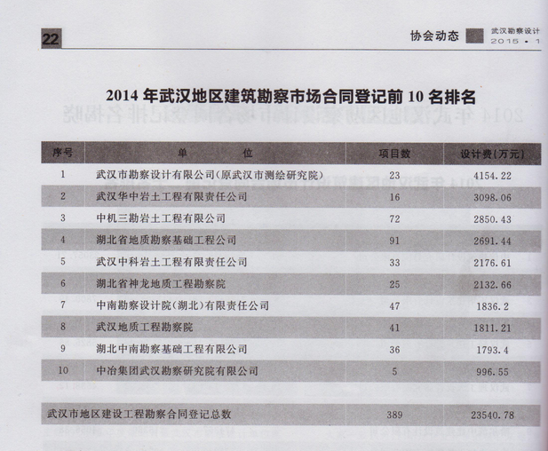 根據(jù)武漢市勘察設計協(xié)會出版的《武漢勘察設計》雜志2015年第一期刊登的最新統(tǒng)計,武漢市勘察設計有限公司2014年全年的勘察合同登記總金額達到4154.22萬元,再次名列武漢地區(qū)第一名。我公司在2012、2013、2014年已連續(xù)三年位居武漢地區(qū)建筑勘察市場合同登記前10名排名的榜首。 (綜合部)