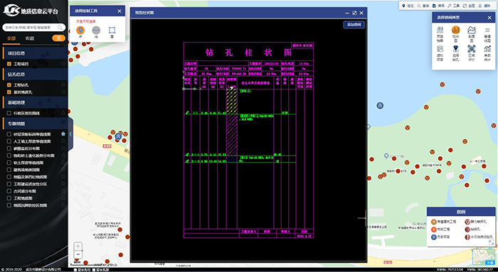 平臺基于標(biāo)準(zhǔn)化的工作流程,采用多重校審及分級管控的手段,通過配置,完成了從數(shù)據(jù)歸檔入庫到在線借閱的全過程服務(wù)與管理,滿足生產(chǎn)效率的同時保證了數(shù)據(jù)的準(zhǔn)確性及安全性。平臺支持鉆孔地層的標(biāo)準(zhǔn)化,完成了歷史存量數(shù)據(jù)的坐標(biāo)轉(zhuǎn)換,解決了因地層代號和坐標(biāo)系不統(tǒng)一而無法共享的問題。平臺實(shí)現(xiàn)了在網(wǎng)頁端基于CAD繪制勘察圖件的功能,支持柱狀圖、剖面圖、等值線圖的自動生成。可有針對性的對研究區(qū)域鉆孔篩選過濾,使統(tǒng)計(jì)分析結(jié)果可靠度更高。平臺具有較完善的數(shù)據(jù)接口,實(shí)現(xiàn)了與公司自主研發(fā)的勘察資料處理軟件的無縫對接,兼容各種地質(zhì)專題GIS數(shù)據(jù)。不僅可直接入庫勘察軟件數(shù)據(jù),還能以項(xiàng)目和鉆孔的維度輸出涵蓋地層及試驗(yàn)信息的可在勘察軟件中直接利用的文件。