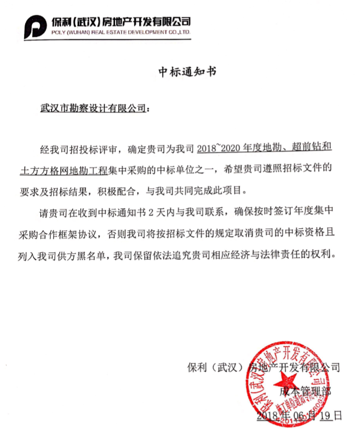 公司中標(biāo)保利(武漢)房地產(chǎn)開發(fā)有限公司2018-2020年度勘察項(xiàng)目